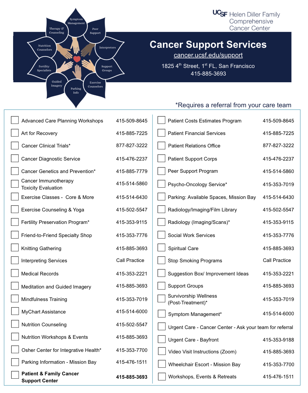 To reach one of our volunteers and find out more about cancer support services, call the main PFCSC line at 415-885-3693, then choose option 5. Leave a clear message and we will return your call. You can also email us at [email protected].